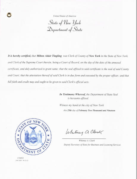 另一种选择是通过https://www.vitalchek.com在线订购纽约的出生和死亡证明。当他们要求“订购证书的理由”时,请务必在订购证书时注明需海牙认证,然后邮件中会包含例证信。