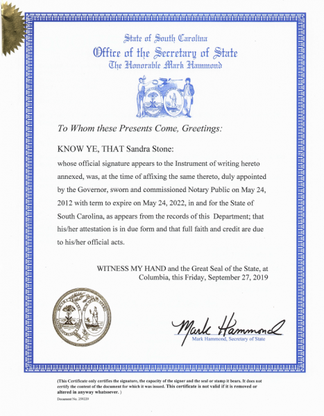 在里奇兰、格林维尔、霍里和查尔斯顿县的遗嘱认证法官签署的文件具有豁免权,这些文件的签名可被认可做海牙认证或Authentication。