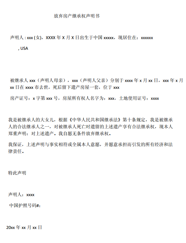 海外居住的华人,不论您是否已加入美国国籍,如果国内父母逝世需要放弃遗产继承权的,需要起草一份放弃遗产继承权声明书并办理公证认证。